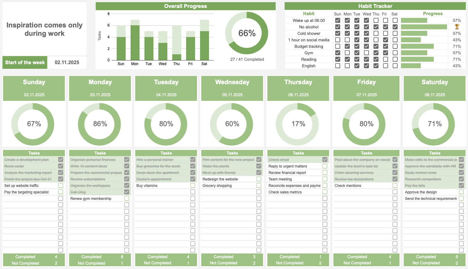 A bundle for those who want to manage both time and money in one system. The finance tracker gives you a clear picture of your income and spending, while the weekly planner helps you organize your tasks.
